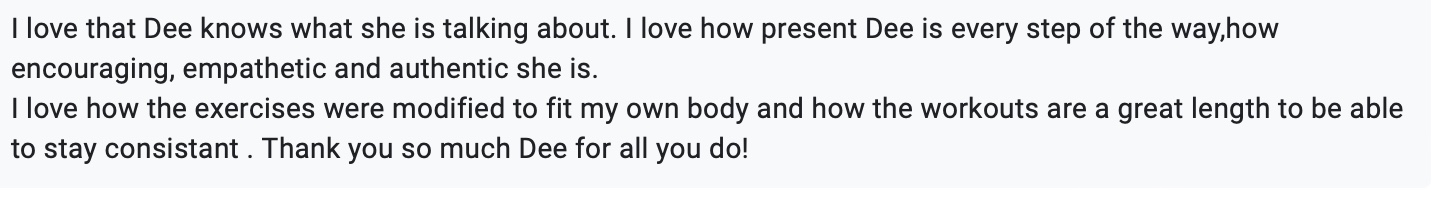 Imagine pushing yourself without making your prolapse or diastasis worse, adding more weight, and having support on live calls that is geared towards you - just like this client that lives in Australia!
