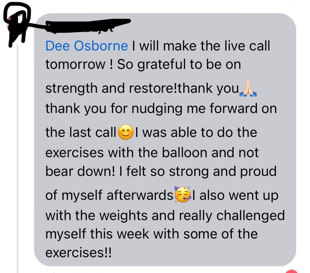 Imagine pushing yourself without making your prolapse or diastasis worse, adding more weight, and having support on live calls that is geared towards you - just like this client that lives in Australia!